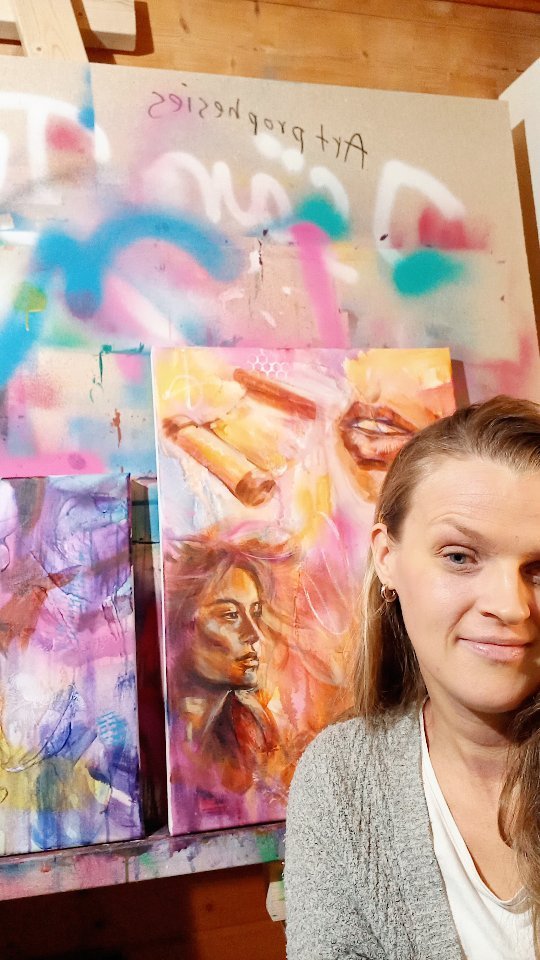 Eläväiset värit yhdessä rohkeiden merkkauksien & spraymaalin kanssa kuvastaa tyyliäni “Sekatekniikan taiteilijana” (Mixed Media). Päätän teokseni aina hienostuneeseen öljyvärikerrokseen. Naishahmot, jotka useimmiten esiintyvät maalauksissani, kantavat syvää viestiä kauneudesta, totuudesta ja kutsumuksesta.